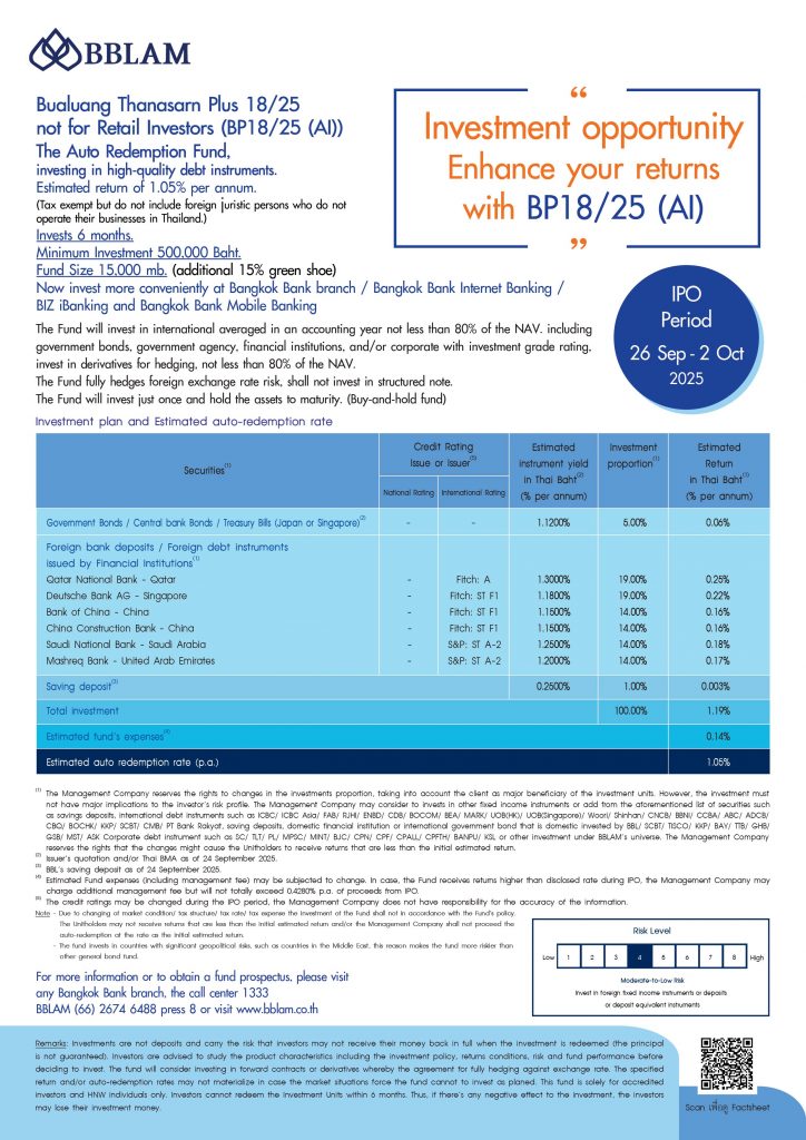รายงานข่าวจาก   บริษัทหลักทรัพย์จัดการกองทุนรวม บัวหลวง จำกัด   หรือ  BBLAM  เปิดเผยว่า  BBLAM  เสนอขายหน่วยลงทุนครั้งแรก (IPO) กองทุนรวมบัวหลวงธนสารพลัส 18/25 ห้ามขายผู้ลงทุนรายย่อย หรือ BP18/25(AI)  ระหว่างวันที่ 26 กันยายน – 2 ตุลาคม 2568  ประมาณการผลตอบแทน  1.05%  ต่อปี  โดยเสนอขายในราคา 10 บาทต่อหน่วย  และผู้ลงทุนจะต้องจองซื้อครั้งแรกขั้นต่ำ 500,000 บาท