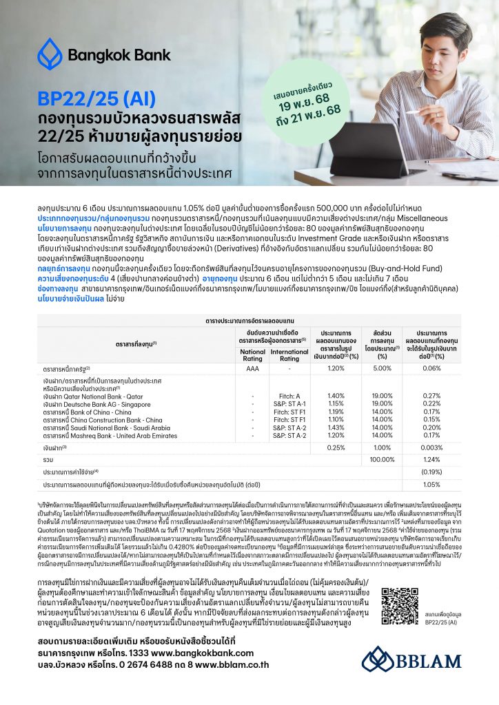 BBLAM เสนอขาย IPO ‘กองทุนรวมบัวหลวงธนสารพลัส 22/25 ห้ามขายผู้ลงทุนรายย่อย’ หรือ BP22/25(AI) ซึ่งเป็นเทอมฟันด์ อายุ 6 เดือน วันที่ 19-21 พฤศจิกายน 2568 นี้ ลงทุนขั้นต่ำ 500,000 บาท เป็นทางเลือกให้ผู้ลงทุนที่มองหาการลงทุนในตราสารหนี้ต่างประเทศเพื่อโอกาสรับผลตอบแทนที่เหมาะสม