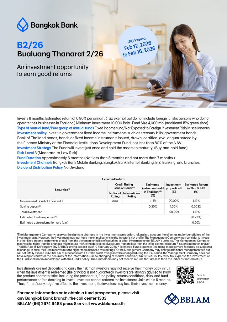รายงานข่าวจาก  บริษัทหลักทรัพย์จัดการกองทุนรวม บัวหลวง จำกัด หรือ BBLAM  เปิดเผยว่า  BBLAM เสนอขายหน่วยลงทุนครั้งแรก (IPO) กองทุนรวมบัวหลวงธนรัฐ 2/26 หรือBualuang Thanarat 2/26  (B2/26) อายุประมาณ 6 เดือน ประมาณการผลตอบแทน 0.90% ต่อปี ขนาดโครงการ 4,000 ล้านบาท โดยเสนอขายในราคา 10 บาทต่อหน่วย และผู้ลงทุนจะต้องจองซื้อครั้งแรกขั้นต่ำ 10,000 บาท