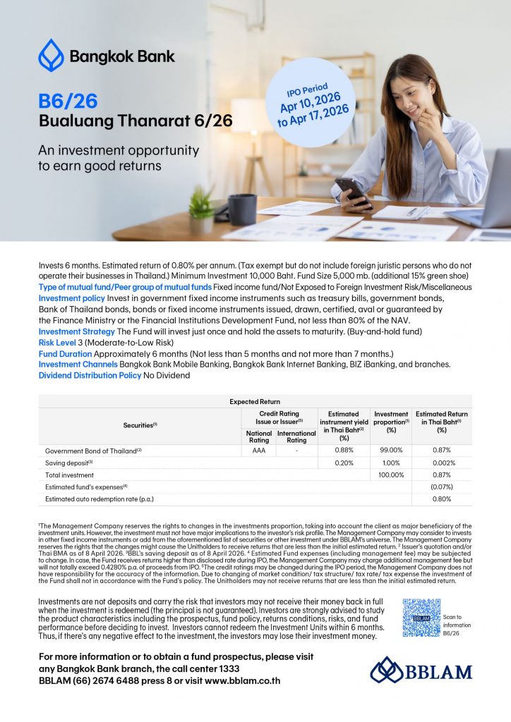 รายงานข่าวจาก บริษัทหลักทรัพย์จัดการกองทุนรวม บัวหลวง จำกัด  หรือ BBLAM  เปิดเผยว่า BBLAM เสนอขายหน่วยลงทุนครั้งแรก (IPO) กองทุนรวมบัวหลวงธนรัฐ 6/26 หรือBualuang Thanarat 6/26  (B6/26) อายุประมาณ 6 เดือน ประมาณการผลตอบแทน 0.80% ต่อปี ขนาดโครงการ 5,000 ล้านบาท โดยเสนอขายในราคา 10 บาทต่อหน่วย และผู้ลงทุนจะต้องจองซื้อครั้งแรกขั้นต่ำ 10,000 บาท