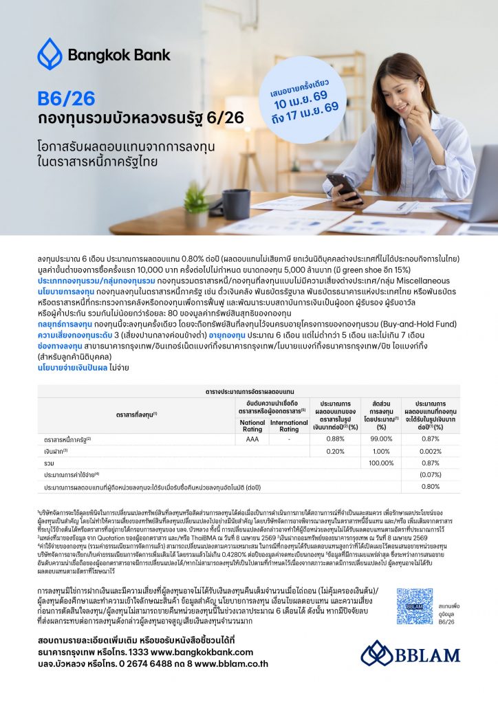 BBLAM เสนอขาย IPO กองทุนรวมบัวหลวงธนรัฐ 6/26 หรือ Bualuang Thanarat 6/26   เน้นลงทุนในตราสารหนี้ภาครัฐ IPO 10-17 เมษายน 2569
