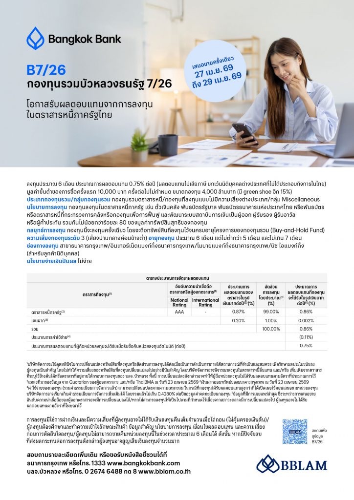 BBLAM เสนอขาย IPO กองทุนรวมบัวหลวงธนรัฐ 7/26 หรือ Bualuang Thanarat 7/26 เน้นลงทุนในตราสารหนี้ภาครัฐ IPO 27-29 เมษายน 2569