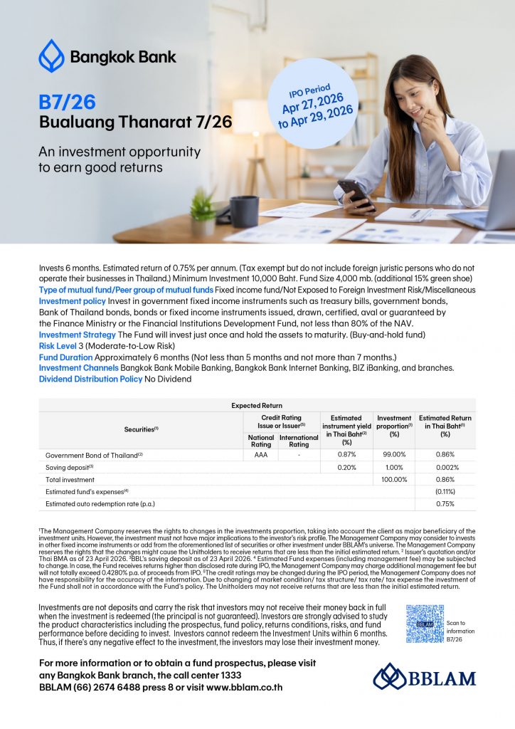 รายงานข่าวจาก บริษัทหลักทรัพย์จัดการกองทุนรวม บัวหลวง จำกัด หรือ BBLAM เปิดเผยว่า BBLAM เสนอขายหน่วยลงทุนครั้งแรก (IPO) กองทุนรวมบัวหลวงธนรัฐ 7/26 หรือBualuang Thanarat 7/26 (B7/26) อายุประมาณ 6 เดือน ประมาณการผลตอบแทน 0.75% ต่อปี ขนาดโครงการ 4,000 ล้านบาท โดยเสนอขายในราคา 10 บาทต่อหน่วย และผู้ลงทุนจะต้องจองซื้อครั้งแรกขั้นต่ำ 10,000 บาท